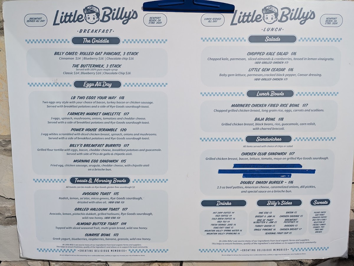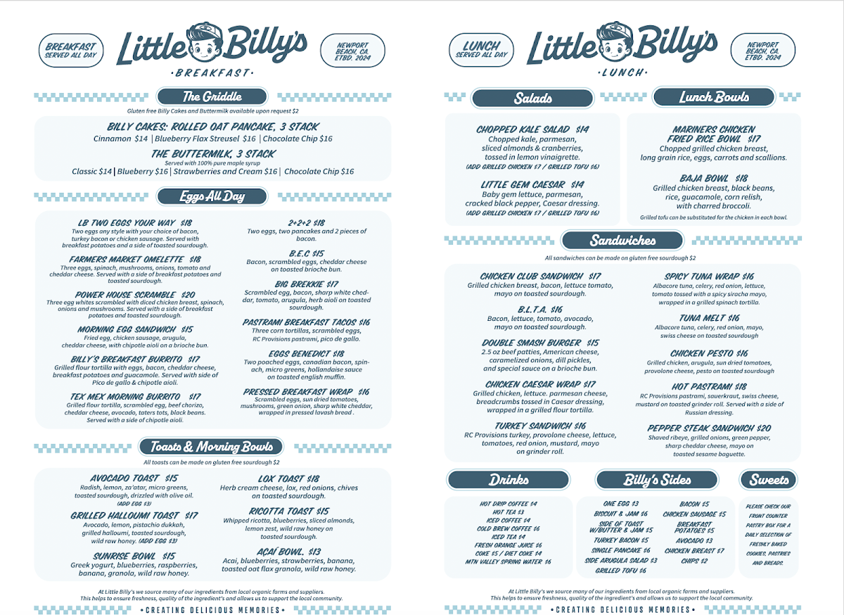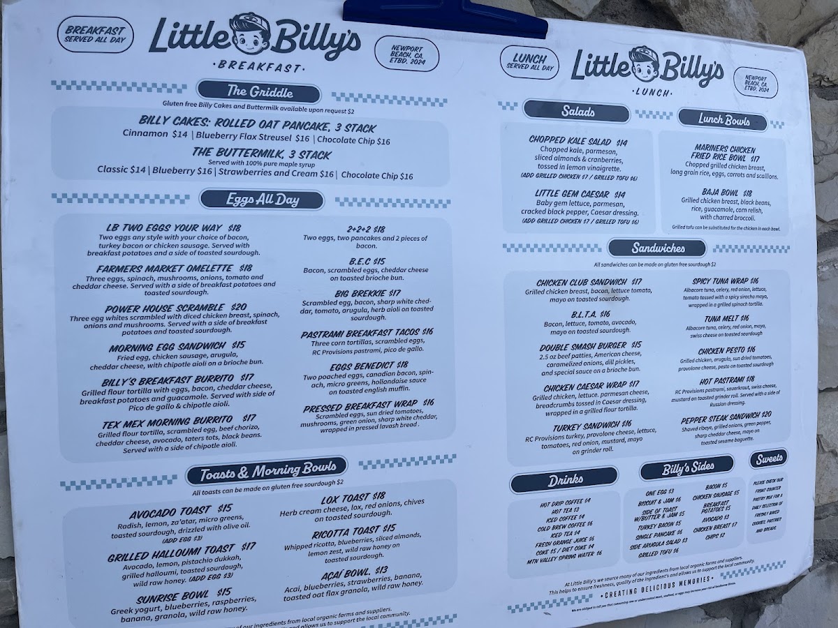 Welcome to Little Billy's, a charming café nestled in Newport Beach, California. This vibrant eatery offers a menu that is as inviting as its cozy atmosphere. Start your day with their renowned cinnamon oat pancakes, which have earned rave reviews for their fluffy texture and incredible flavor. Another standout is the ricotta toast topped with fresh blueberries and drizzled with honey—a delightful way to indulge your taste buds.